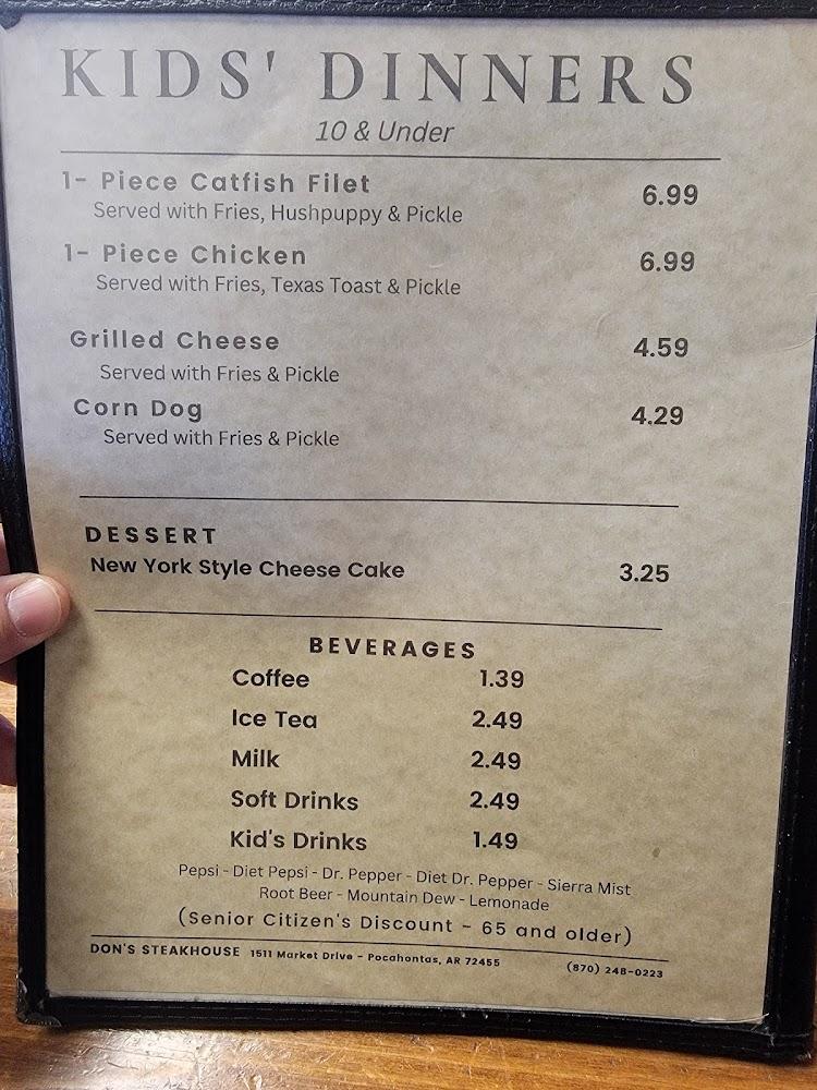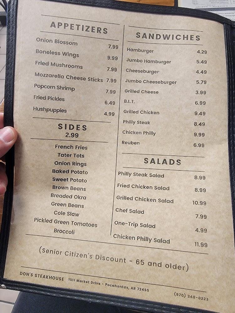 Don's Steakhouse, located at 1511 Market Dr, Pocahontas, AR, offers a relaxed and inviting atmosphere perfect for lunch, dinner, or solo dining. Specializing in classic American grilled dishes, the menu features simple, healthy options with a local twist. Enjoy excellent coffee, a wide selection of teas, and small shareable portions. Amenities include drive-thru, takeout, delivery, and private dining. The restaurant is fully accessible with wheelchair-friendly entrances, seating, and restrooms. Ideal for groups and tourists alike, Don's Steakhouse welcomes reservations and provides a kid-friendly menu with high chairs, ensuring a family-friendly experience. Payment by credit, debit, and mobile options accepted. Download PDF Menu