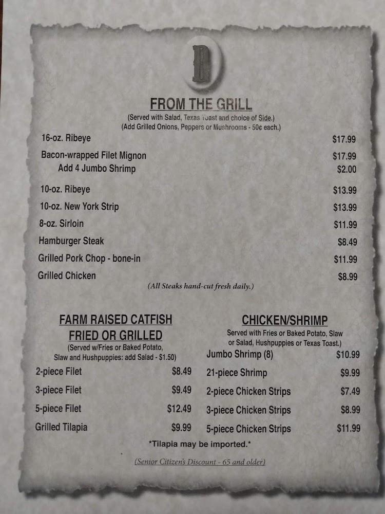 Don's menu is a steak lover's heaven, featuring ribeyes, filets, and more. Besides grilled delights, fried catfish and shrimp offer local flavors. Sandwiches tempt with hearty fillings like hamburgers and jumbo cheeseburgers. There are light bites too, as appetizers like fried pickles and onion blossoms.